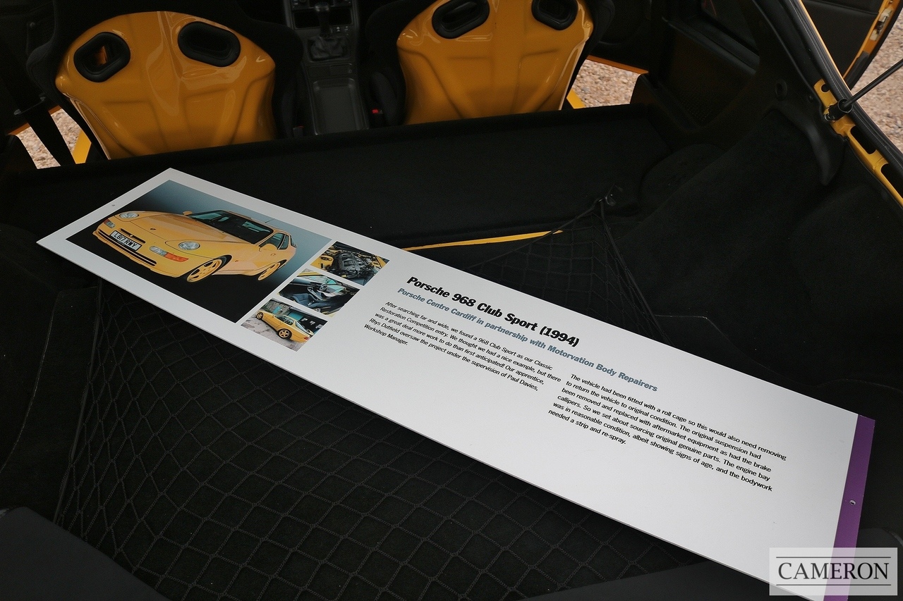 This 968 underwent a restoration by Porsche Centre Cardiff in 2016 using genuine Porsche parts with the paintwork completed by a Porsche Approved Bodyshop to be entered in the '40 years at the front' Porsche Classic Restoration Concours Competition. This car was chosen for its excellent condition, desirable colour, low mileage, low ownership, strong specification, and full Porsche service history.